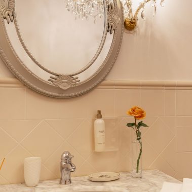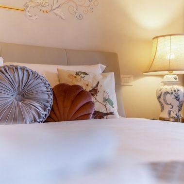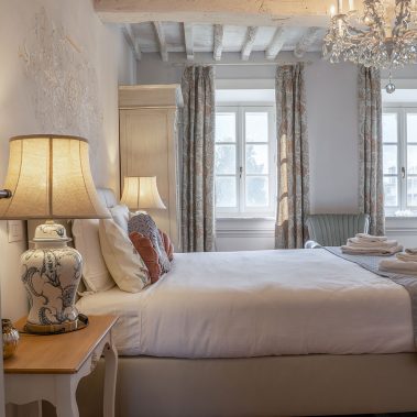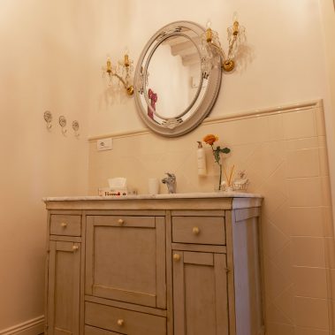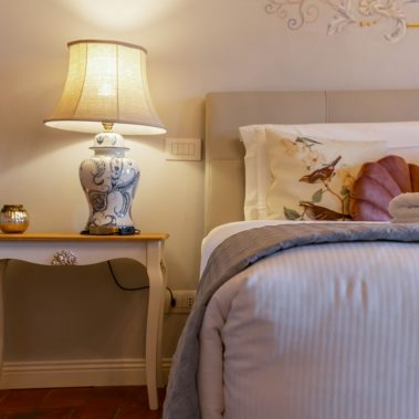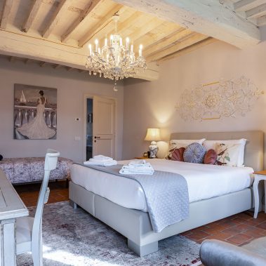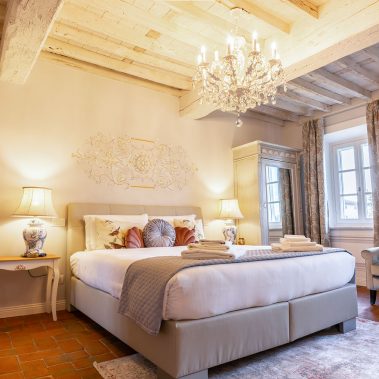 Weichheit, Ruhe, Gelassenheit und Eleganz atmet man in diesem schönen, 26 m² großen Zimmer mit 2 großen Fenstern und einem herrlichen Blick auf den üppigen Garten der Villa. Die Einrichtung, die Stoffe, die Decke mit leicht gebleichten Balken, der originale Terrakottaboden, der Fries an der Wand, das Ganze verleiht dem Raum Natürlichkeit und eine besondere Note.